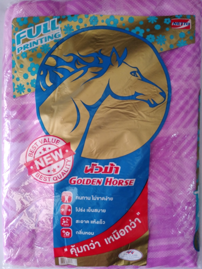 มุ้งกาง 4 หู ตราหัวม้า ผ้าเกล็ดปลา​ เป็นมุ้งผ้าสี​ พิมพ์ลายทั้งหลัง คุณภาพดี ขนาด 6 ฟุต​
