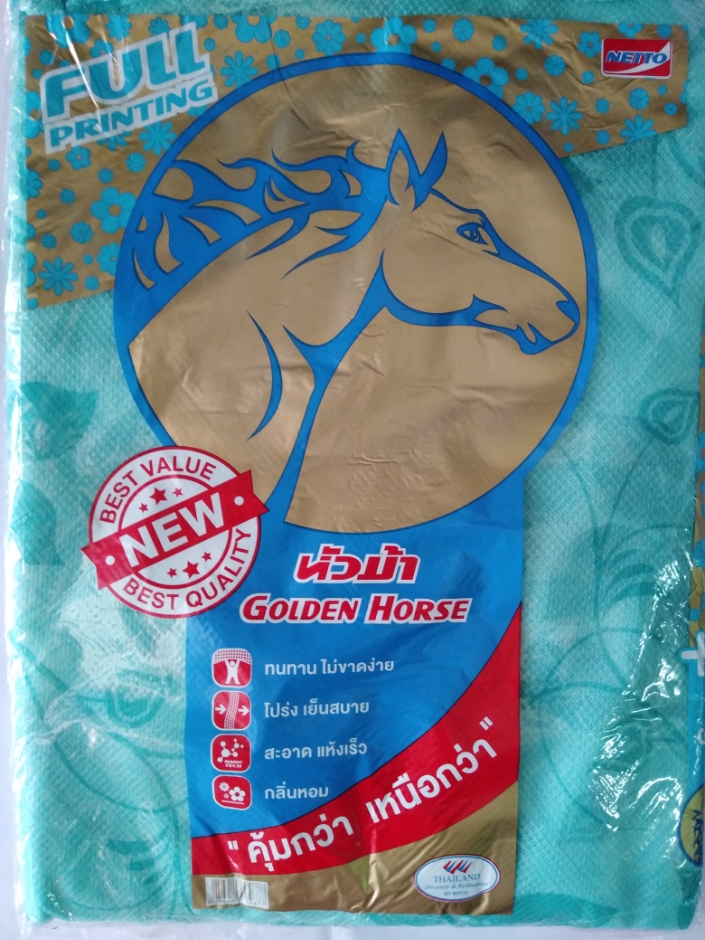 มุ้งกาง 4 หู ตราหัวม้า ผ้าเกล็ดปลา​ เป็นมุ้งผ้าสี​ พิมพ์ลายทั้งหลัง คุณภาพดี ขนาด 6 ฟุต​