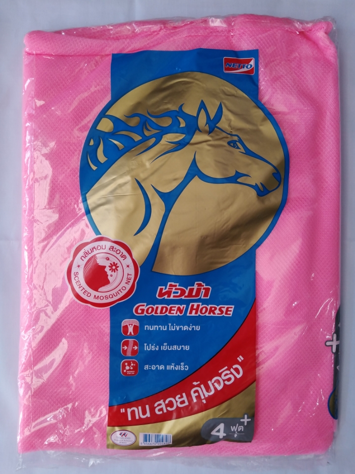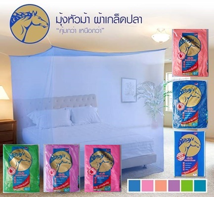 มุ้งกาง 4 หู ตราหัวม้า ผ้าเกล็ดปลา เป็นมุ้งผ้าสี คุณภาพดี